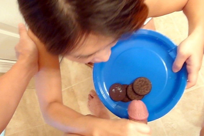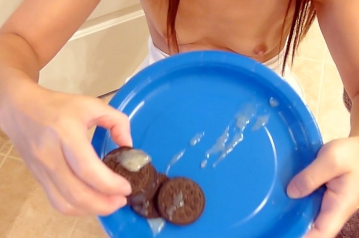 之後芬婆迫不及待拿起餅乾,上面有一大坨精液,直接送進嘴吃下。