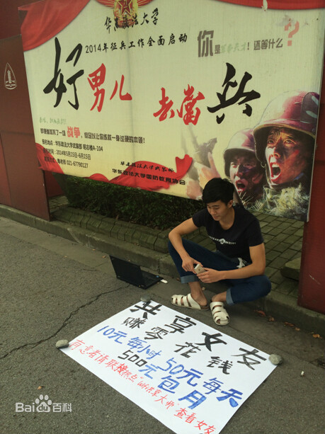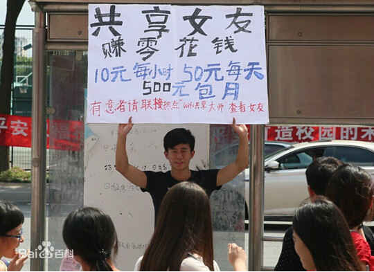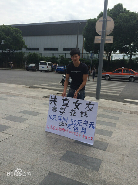 拿著一張大字報擺攤,上寫「共享女友賺零花錢」,男生自稱是大一新生,擺攤