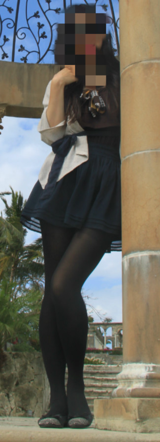 然後我一隻腳從她雙腿之間伸進去,由於她的裙子很短,加上蹲著縮上去,直接
